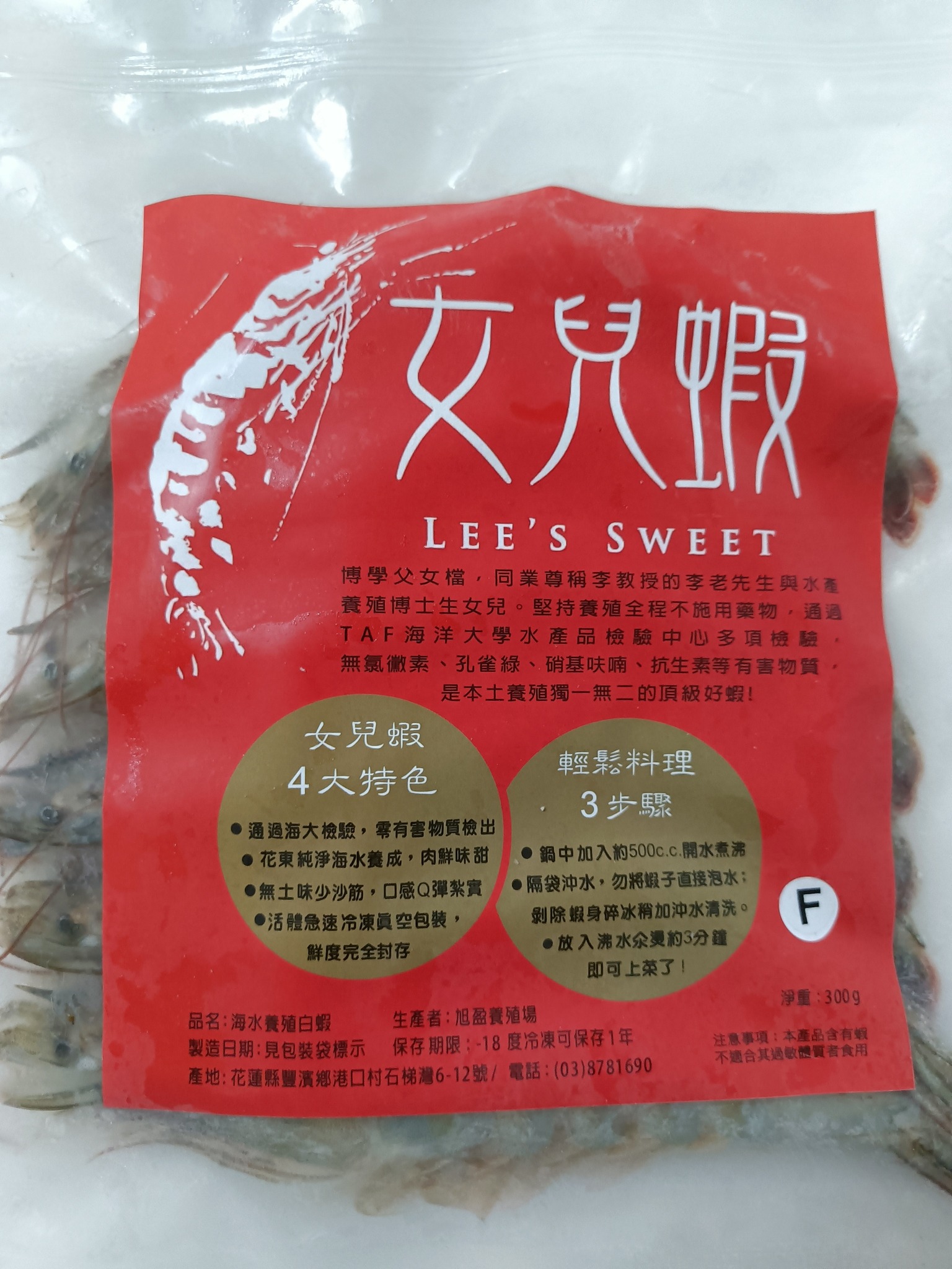 旭盈養殖場位於花蓮縣豐濱鄉港口村,場域面積約 2.7 分地,設有育苗池 2座及白蝦育成池 2 座,無用藥,用心養殖就像呵護女兒一般的對待,以太平洋黑潮孕育出頂級美味白蝦,因而建立品牌女兒蝦。
